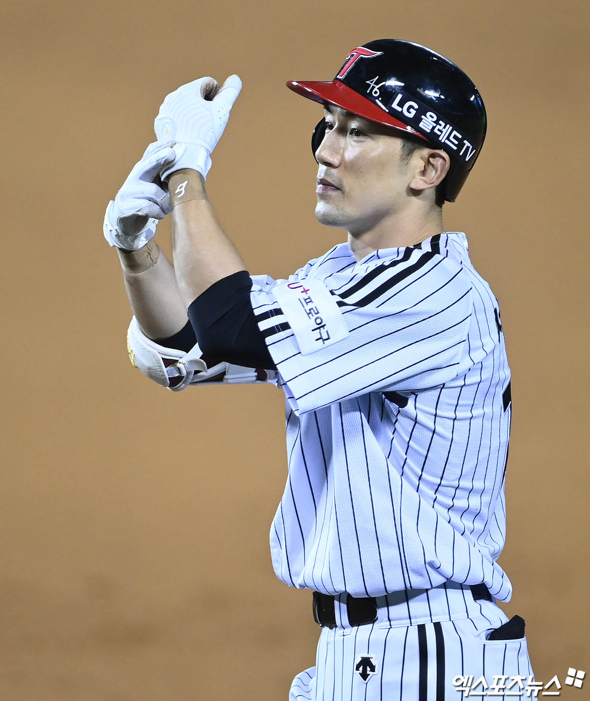 (엑스포츠뉴스 잠실, 박지영 기자) 3일 오후 서울 송파구 잠실야구장에서 열린 '2021 신한은행 SOL KBO리그' NC 다이노스와 LG 트윈스의 경기, 7회말 무사 1루 LG 서건창이 번트 안타로 출루한 뒤 세리머니를 하고 있다.