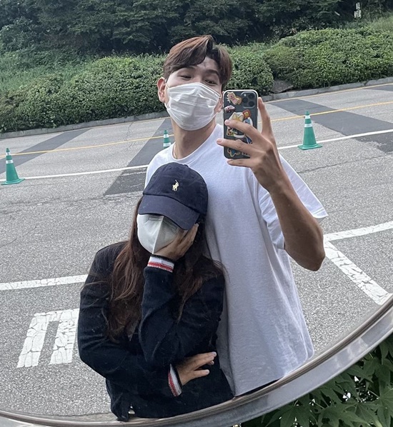 공개된 사진 속 홍현희는 제이쓴 품에 기댄 모습. 모자와 마스크로 가려진 탓에 메이크업 잘 된 얼굴을 볼 수 없어 아쉬움을 남긴다.