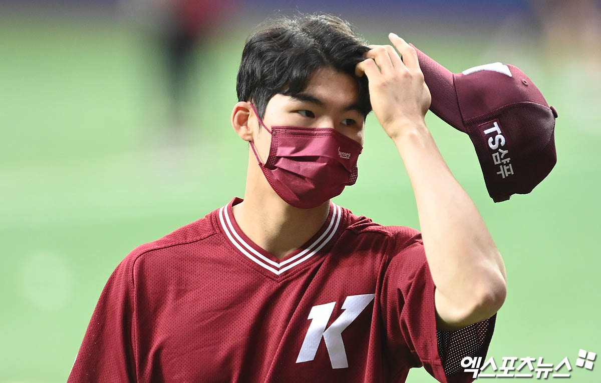 (엑스포츠뉴스 고척, 박지영 기자) 5일 오후 서울 구로구 고척스카이돔에서 열리는 '2021 신한은행 SOL KBO리그' SSG 랜더스와 키움 히어로즈의 경기에 앞서 키움 김혜성이 훈련에 나서고 있다.