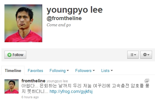 [엑스포츠뉴스=온라인뉴스팀] 국가대표 주전 수비수로 활약했고 대표팀 은퇴를 앞둔 이영표(알 힐랄)가 트위터에 차두리(셀틱)의 문신에 관해 글을 남겨 화제가 되고 있다.