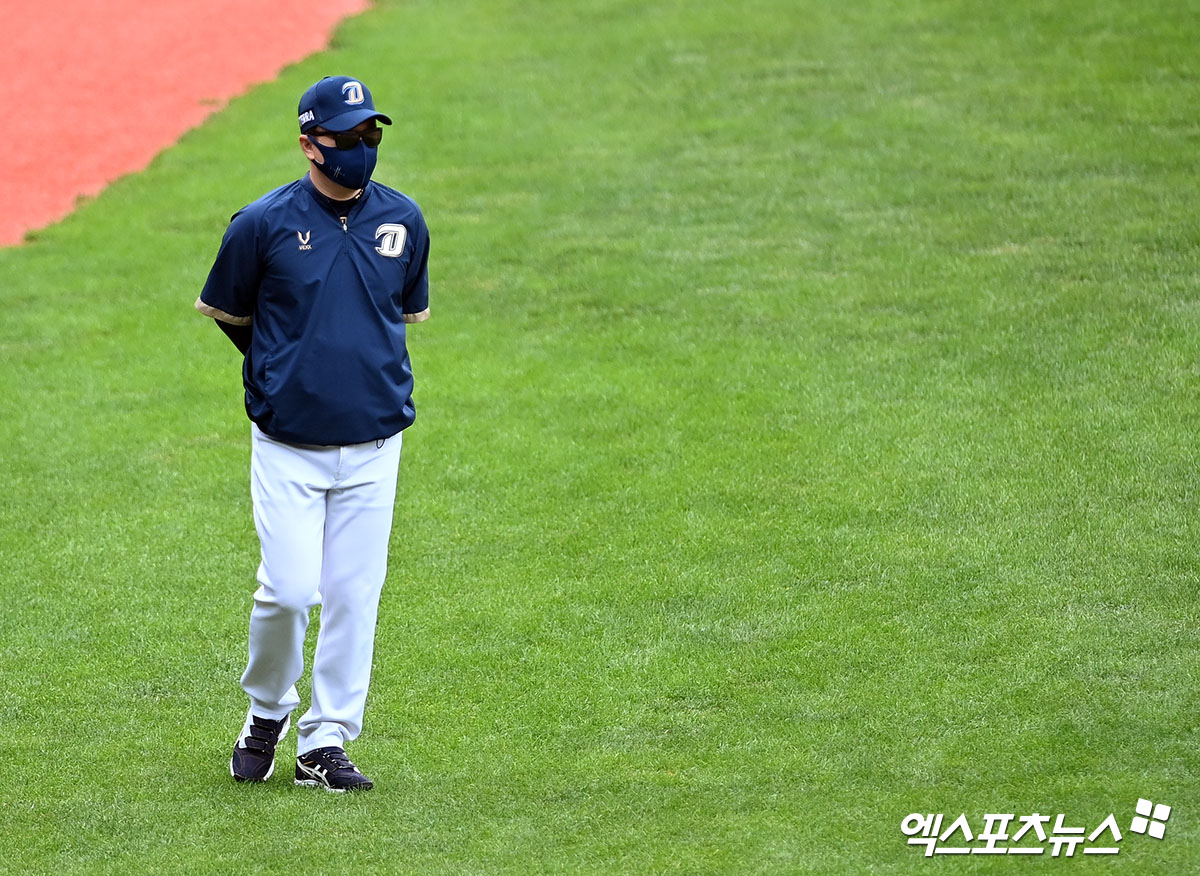 (엑스포츠뉴스 잠실, 김한준 기자) 21일 오후 서울 송파구 잠실야구장에서 열리는 '2021 신한은행 SOL KBO리그' NC 다이노스와 두산 베어스의 경기, NC 이동욱 감독이 그라운드를 체크하고 있다.