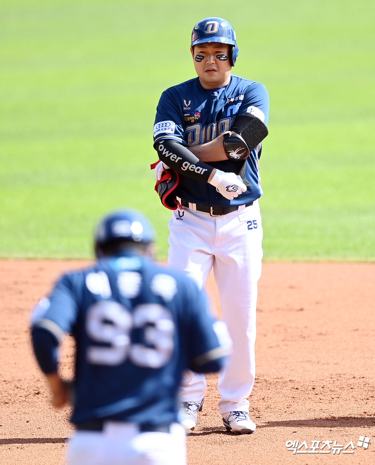 (엑스포츠뉴스 잠실, 김한준 기자) 21일 오후 서울 송파구 잠실야구장에서 열린 '2021 신한은행 SOL KBO리그' NC 다이노스와 두산 베어스의 경기, 2회초 NC 양의지가 2루타로 출루한 후 타임을 요청하고 있다.