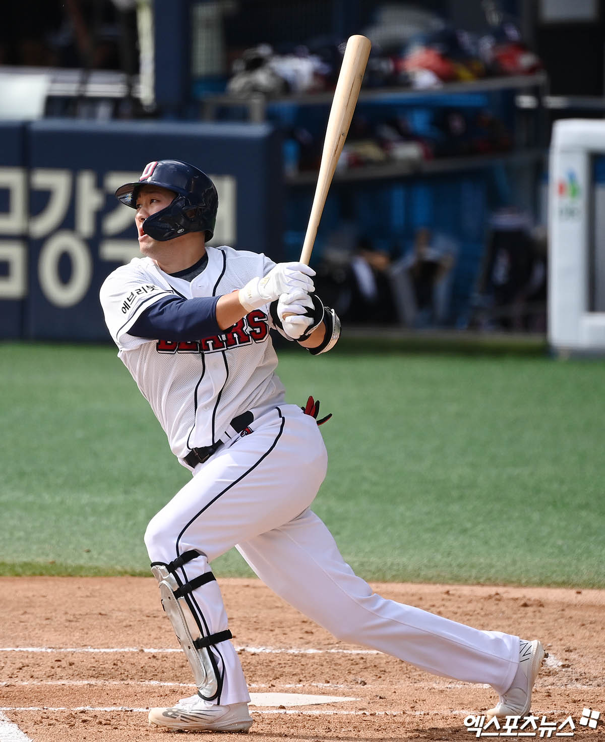 (엑스포츠뉴스 잠실, 박지영 기자) 22일 오후 서울 송파구 잠실야구장에서 열린 '2021 신한은행 SOL KBO리그' NC 다이노스와 두산 베어스의 경기, 1회말 2사 1,2루 두산 양석환이 1타점 적시타를 때려내고 있다.