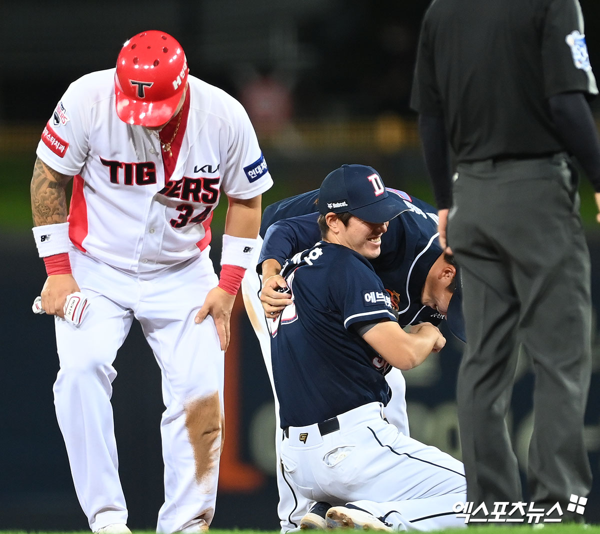 (엑스포츠뉴스 광주, 김한준 기자) 23일 오후 광주-기아 챔피언스필드에서 열린 '2021 신한은행 SOL KBO리그' 두산 베어스와 KIA 타이거즈의 경기, 6회말 1사 1,2루 두산 김재호와 박계범이 KIA 터커의 내야땅볼때 더블 플레이로 이닝을 종료 시킨 후 미소를 보이고 있다.