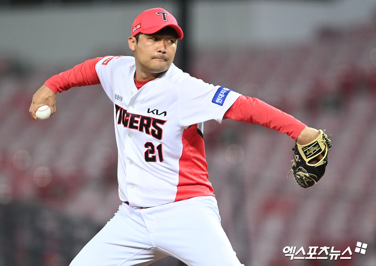 (엑스포츠뉴스 광주, 김한준 기자) 23일 오후 광주-기아 챔피언스필드에서 열린 '2021 신한은행 SOL KBO리그' 두산 베어스와 KIA 타이거즈의 경기, 7회초 2사 만루 KIA 홍상삼이 공을 힘차게 던지고 있다.