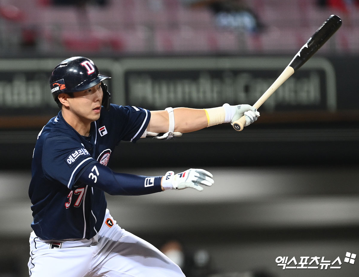 (엑스포츠뉴스 광주, 김한준 기자) 24일 오후 광주-기아 챔피언스필드에서 열린 '2021 신한은행 SOL KBO리그' 두산 베어스와 KIA 타이거즈의 경기, 7회초 1사 1루 두산 박건우가 우전안타를 날리고 있다.