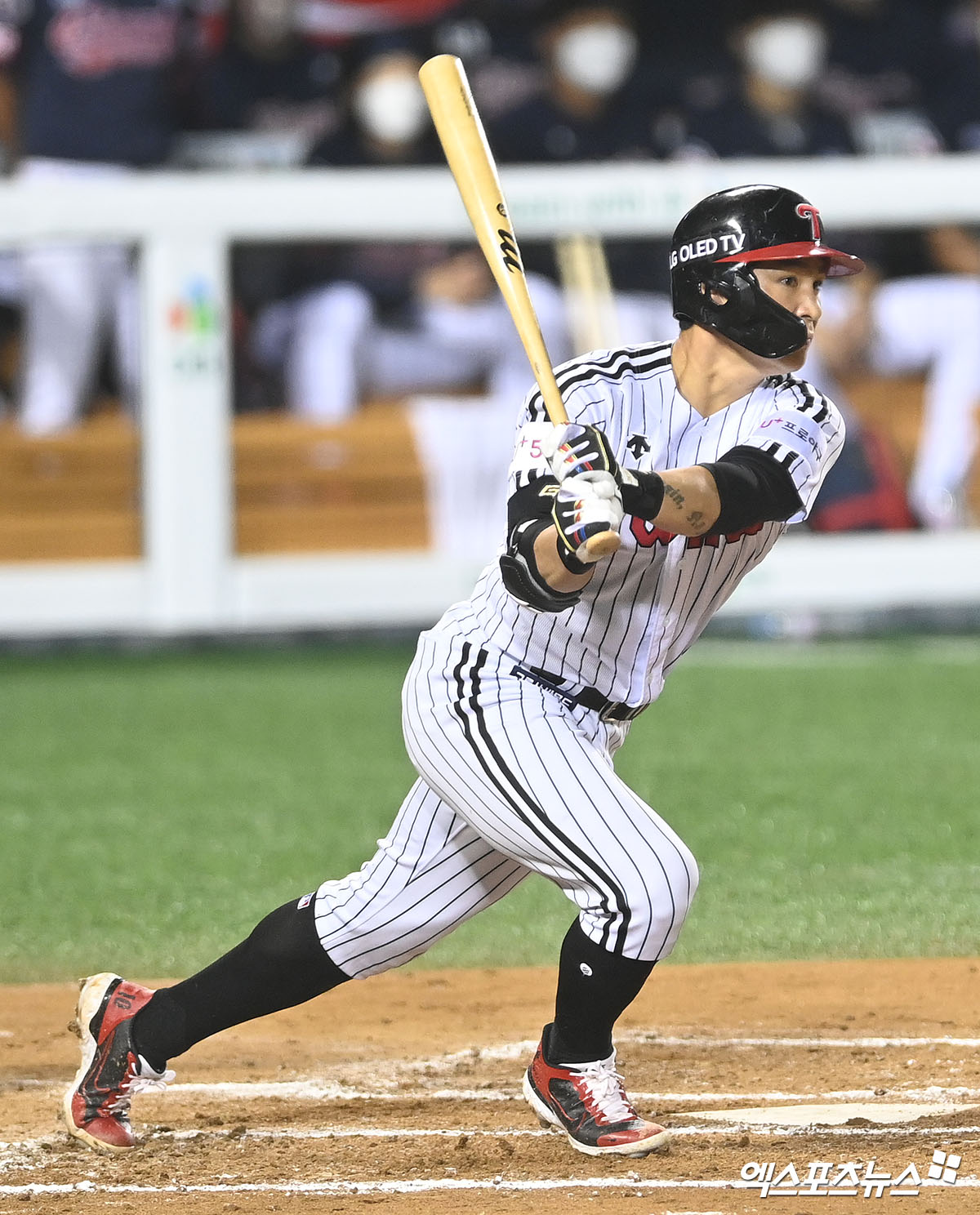 (엑스포츠뉴스 잠실, 김한준 기자) 28일 오후 서울 송파구 잠실야구장에서 열린 '2021 신한은행 SOL KBO리그' 롯데 자이언츠와 LG 트윈스의 경기, 1회말 1사 1,3루 LG 오지환이 타격을 하고 있다.