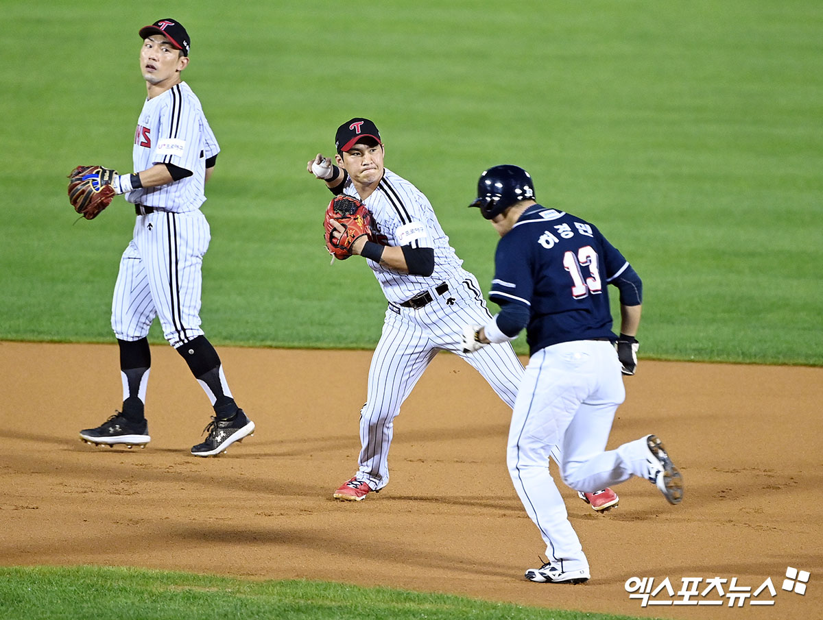 (엑스포츠뉴스 잠실, 김한준 기자) 30일 오후 서울 송파구 잠실야구장에서 열린 '2021 신한은행 SOL KBO리그' 두산 베어스와 LG 트윈스의 경기, 1회초 무사 1루 LG 오지환이 두산 페르난데스의 내야땅볼때 허경민을 포스아웃 시킨 후 1루로 송구하고 있다.