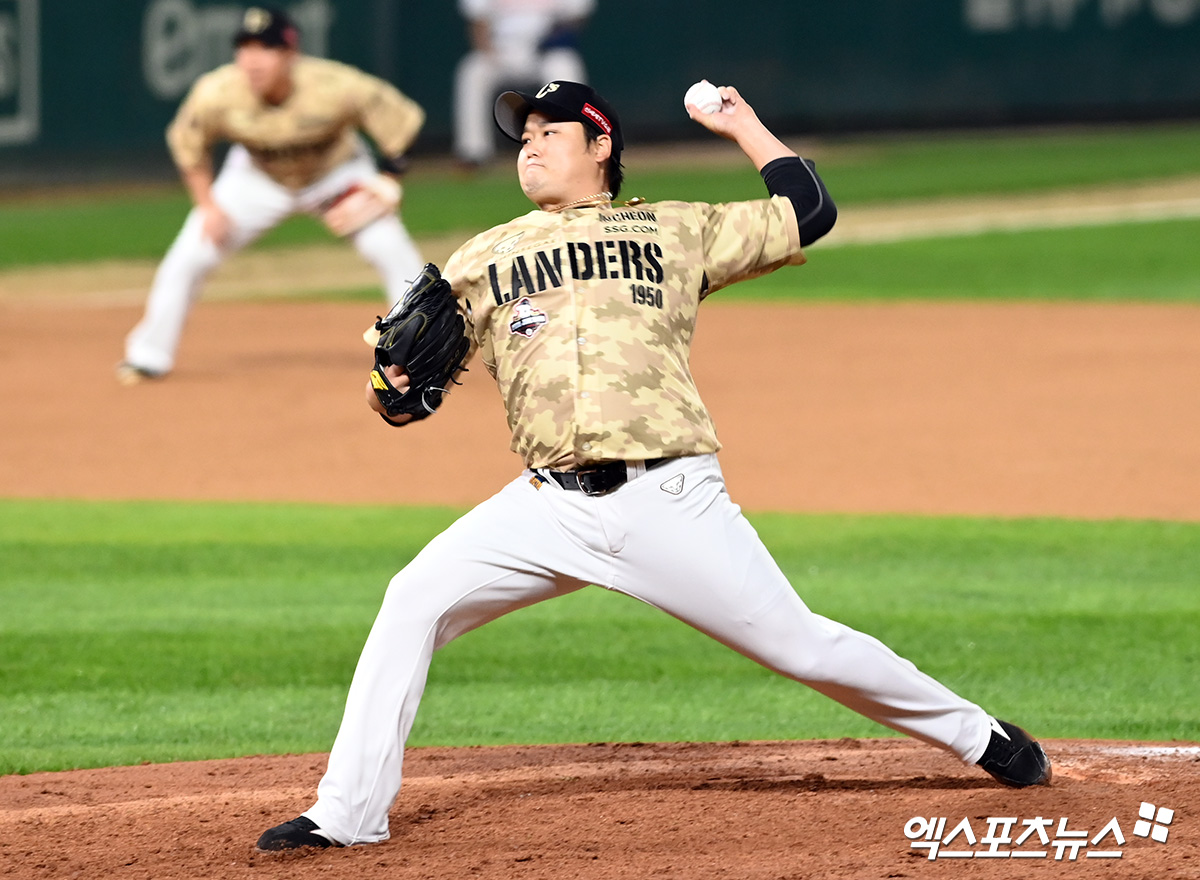 (엑스포츠뉴스 인천, 고아라 기자) 2일 오후 인천 SSG랜더스필드에서 열린 '2021 신한은행 SOL KBO리그' KT 위즈와 SSG 랜더스의 경기, 8회초 SSG 김태훈이 공을 힘차게 던지고 있다.