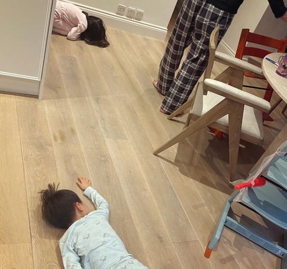 공개된 사진 속에는 부엌 바닥에 자연스럽게 누워있는 두 자녀의 모습이 담겼다. 유쾌한 박지성, 김민지 부부 가족의 런던 일상이 눈길을 끈다.