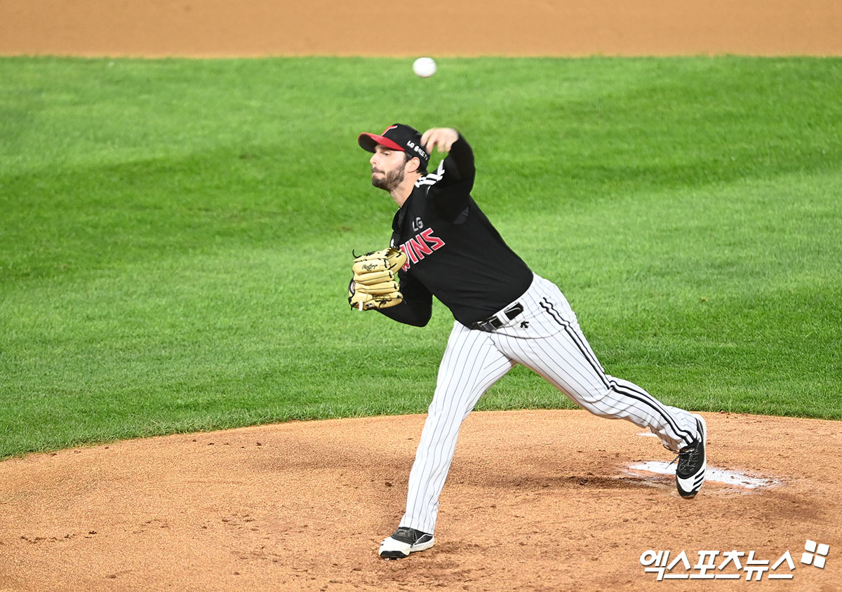 (엑스포츠뉴스 인천, 김한준 기자) 12일 오후 인천 SSG랜더스필드에서 열린 '2021 신한은행 SOL KBO리그' LG 트윈스와 SSG 랜더스의 경기, 1회말 LG 선발투수 수아레즈가 공을 힘차게 던지고 있다.