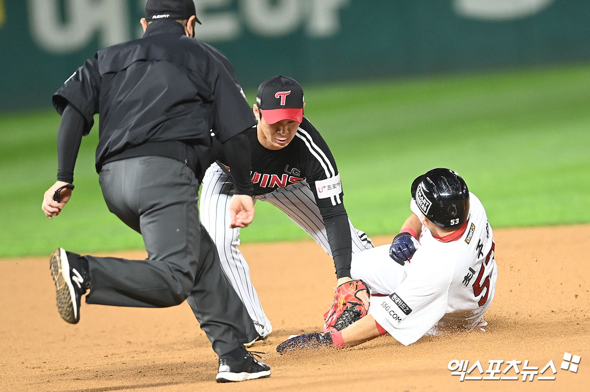 (엑스포츠뉴스 인천, 김한준 기자) 12일 오후 인천 SSG랜더스필드에서 열린 '2021 신한은행 SOL KBO리그' LG 트윈스와 SSG 랜더스의 경기, 6회말 2사 1루 SSG 최주환이 2루 도루를 시도하다 LG 오지환에게 태그 아웃을 당하고 있다.