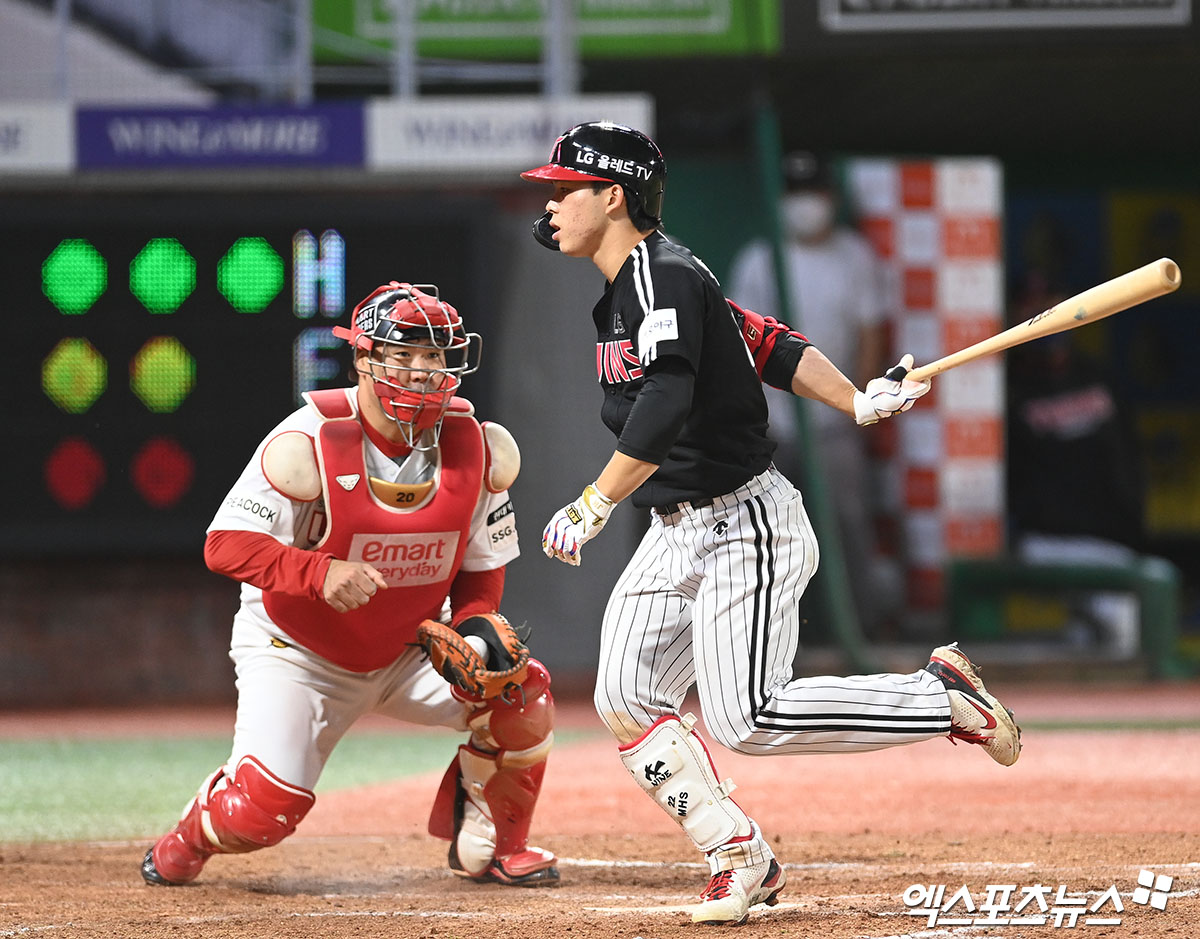 (엑스포츠뉴스 인천, 김한준 기자) 12일 오후 인천 SSG랜더스필드에서 열린 '2021 신한은행 SOL KBO리그' LG 트윈스와 SSG 랜더스의 경기, 8회초 2사 1,2루 LG 문성주가 헛스윙 삼진을 당하고 있다.