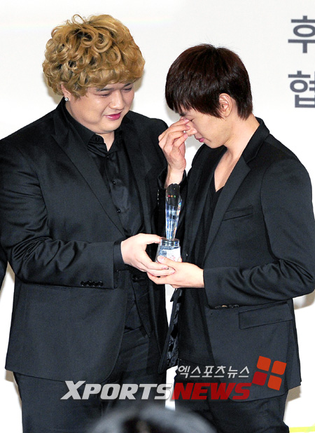 [엑스포츠뉴스 = 권태완 기자] 9일 오후 서울 중구 프레스센터에서 열린 '가온차트 2010 총결산 및 비전선포식'에서 음반판매 1위를 차지한 슈퍼주니어 신동이 트로피를 은혁에게 주자 감동의 눈물을 흘리는 듯한 장난을 치고 있다.