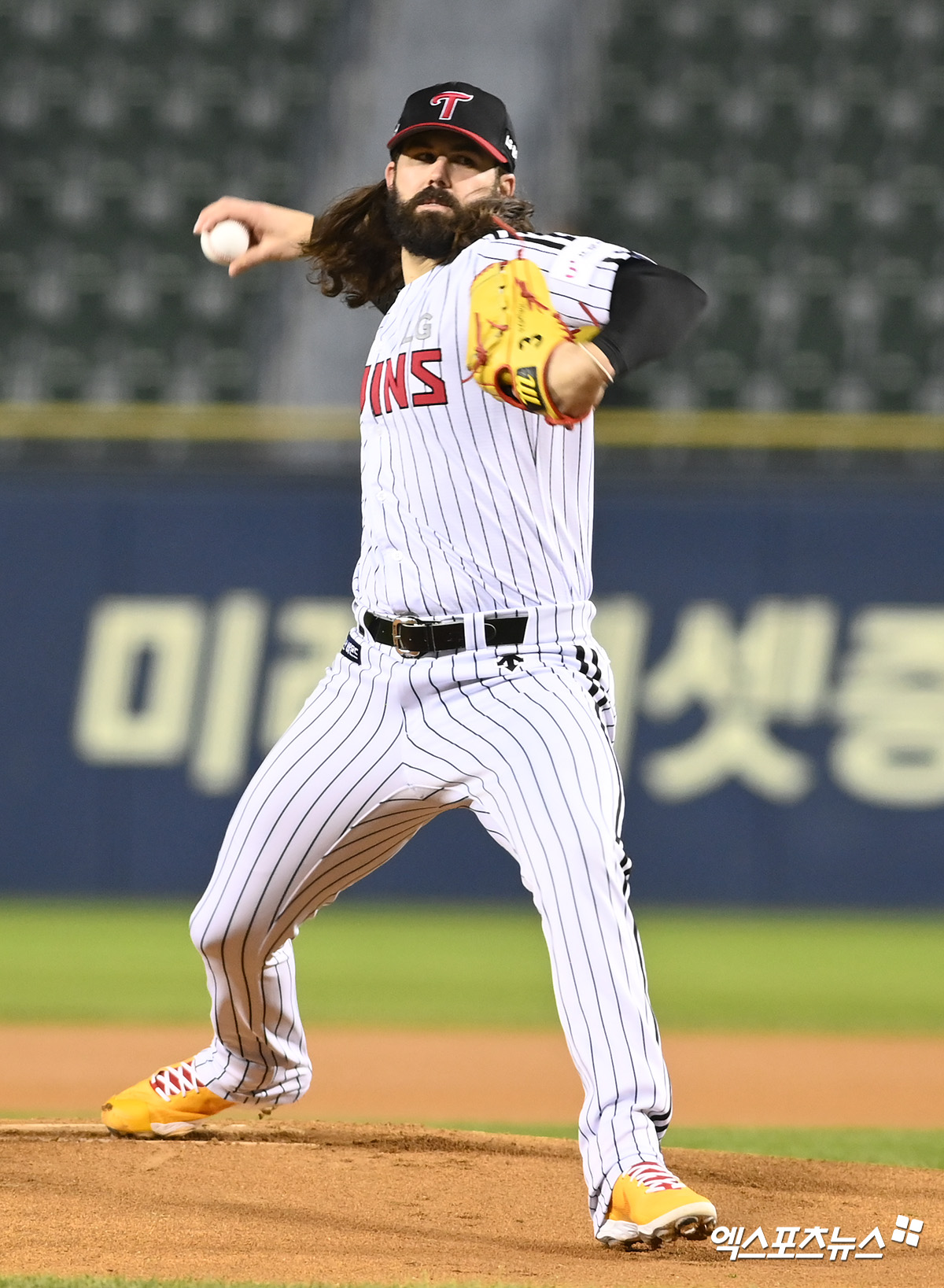 (엑스포츠뉴스 잠실, 고아라 기자) 20일 오후 서울 송파구 잠실야구장에서 열린 '2021 신한은행 SOL KBO리그' 키움 히어로즈와 LG 트윈스의 경기, 1회초 LG 선발투수 켈리가 공을 힘차게 던지고 있다.