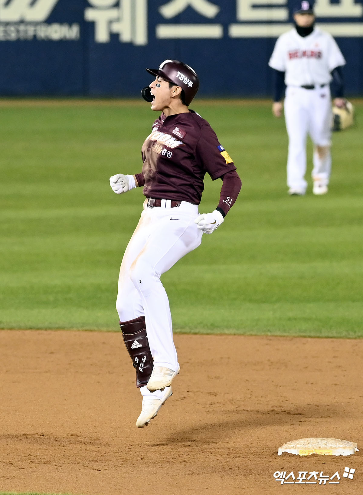 마침내 9회. 가장 중요한 순간에서 이정후가 타격 기회를 잡았다. 4-4 동점이었던 9회 2사 1, 2루에서 이정후는 마무리 김강률의 146km/h 직구를 걷어 올려 중견수 키를 넘기는 2타점 2루타를 작렬했다. 승부처에서 결승타를 폭발한 주인공은 포효하며 최고의 순간을 만끽했다. 단연 이날 경기의 백미였다.