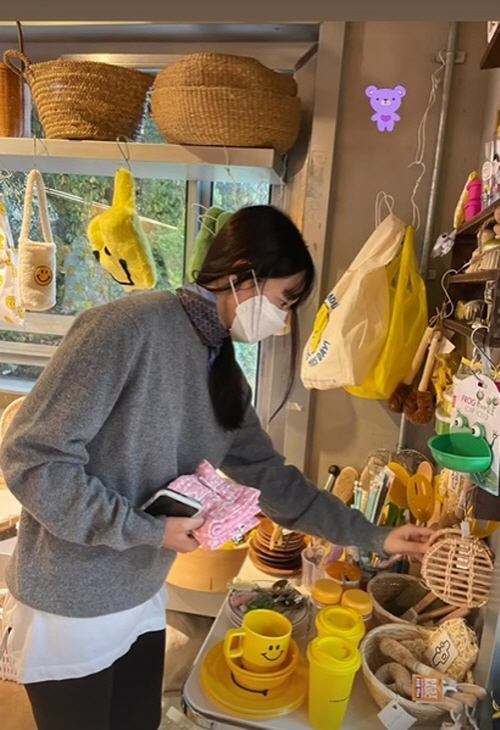 손에 물건을 가득 들고 아기자기한 소품을 고르고 있다.