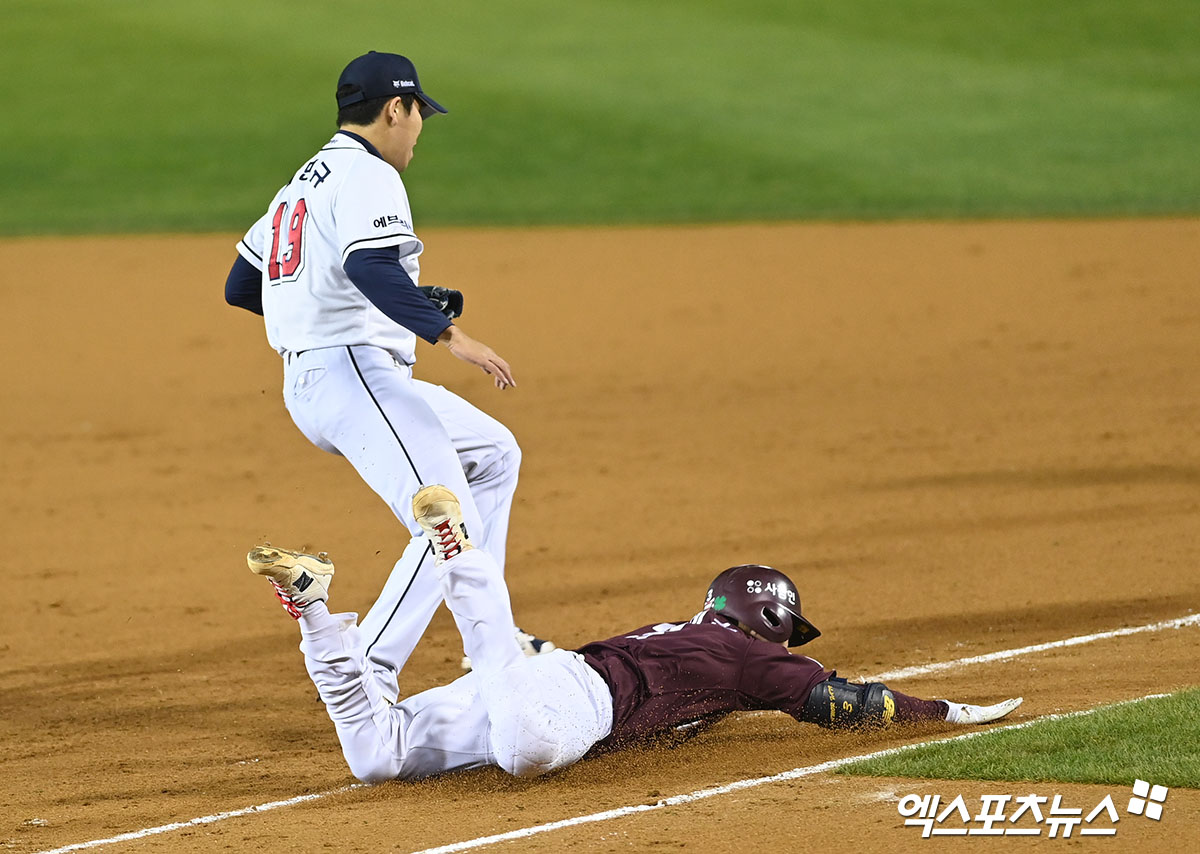 (엑스포츠뉴스 잠실, 김한준 기자) 2일 오후 서울 송파구 잠실야구장에서 열린 '2021 신한은행 SOL KBO리그' 포스트시즌 와일드카드 결정전 2차전 키움 히어로즈와 두산 베어스의 경기, 4회초 키움 김혜성이 1루수 앞 땅볼을 친 후 헤드퍼스트 슬라이딩을 시도하며 1루에서 세이프되고 있다.