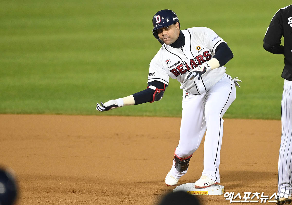 (엑스포츠뉴스 잠실, 박지영 기자) 5일 오후 서울 송파구 잠실야구장에서 열린 '2021 신한은행 SOL KBO리그' 포스트시즌 LG 트윈스와 두산 베어스의 준플레이오프 2차전 경기, 1회말 1사 두산 페르난데스가 2루타를 때려낸 뒤 세리머니를 하고 있다.