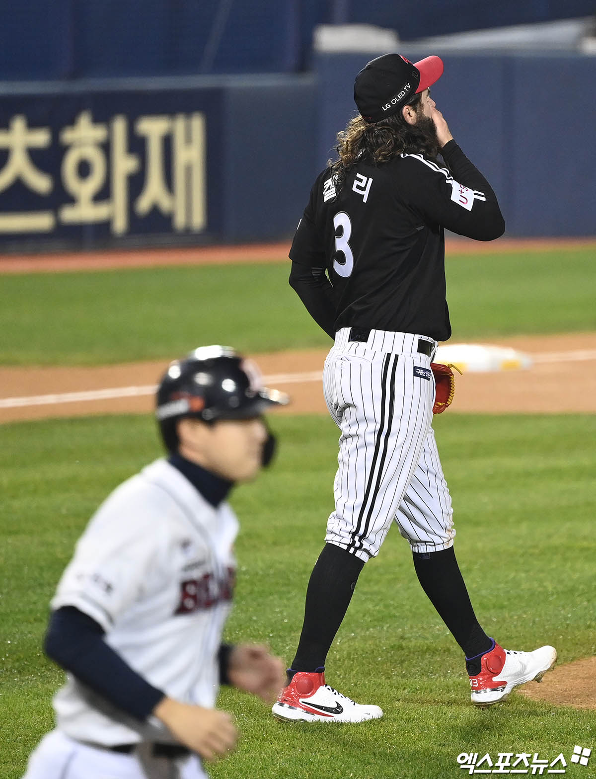 (엑스포츠뉴스 잠실, 박지영 기자) 5일 오후 서울 송파구 잠실야구장에서 열린 '2021 신한은행 SOL KBO리그' 포스트시즌 LG 트윈스와 두산 베어스의 준플레이오프 2차전 경기, 1회말 1사 2루 LG 선발투수 켈리가 두산 박건우에게 볼넷을 허용한 뒤 아쉬워하고 있다.