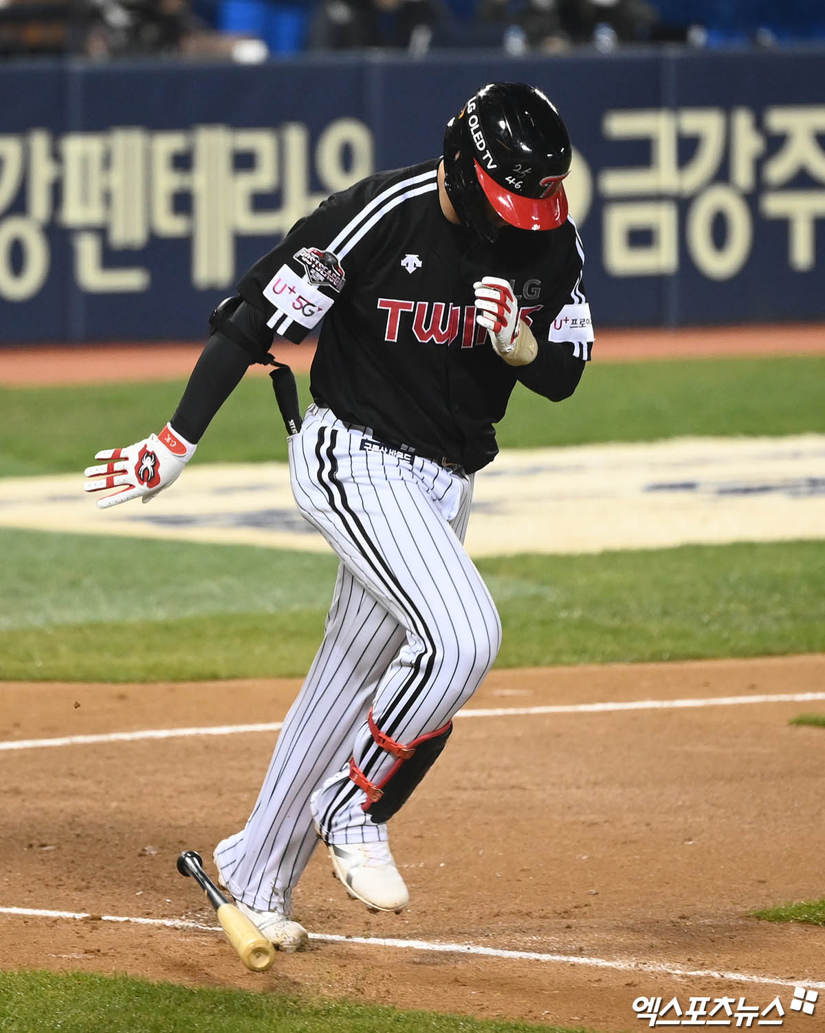 (엑스포츠뉴스 잠실, 박지영 기자) 5일 오후 서울 송파구 잠실야구장에서 열린 '2021 신한은행 SOL KBO리그' 포스트시즌 LG 트윈스와 두산 베어스의 준플레이오프 2차전 경기, 3회초 1사 LG 홍창기가 외야 플라이 타구를 때려낸 뒤 아쉬워하며 배트를 내던지고 있다.