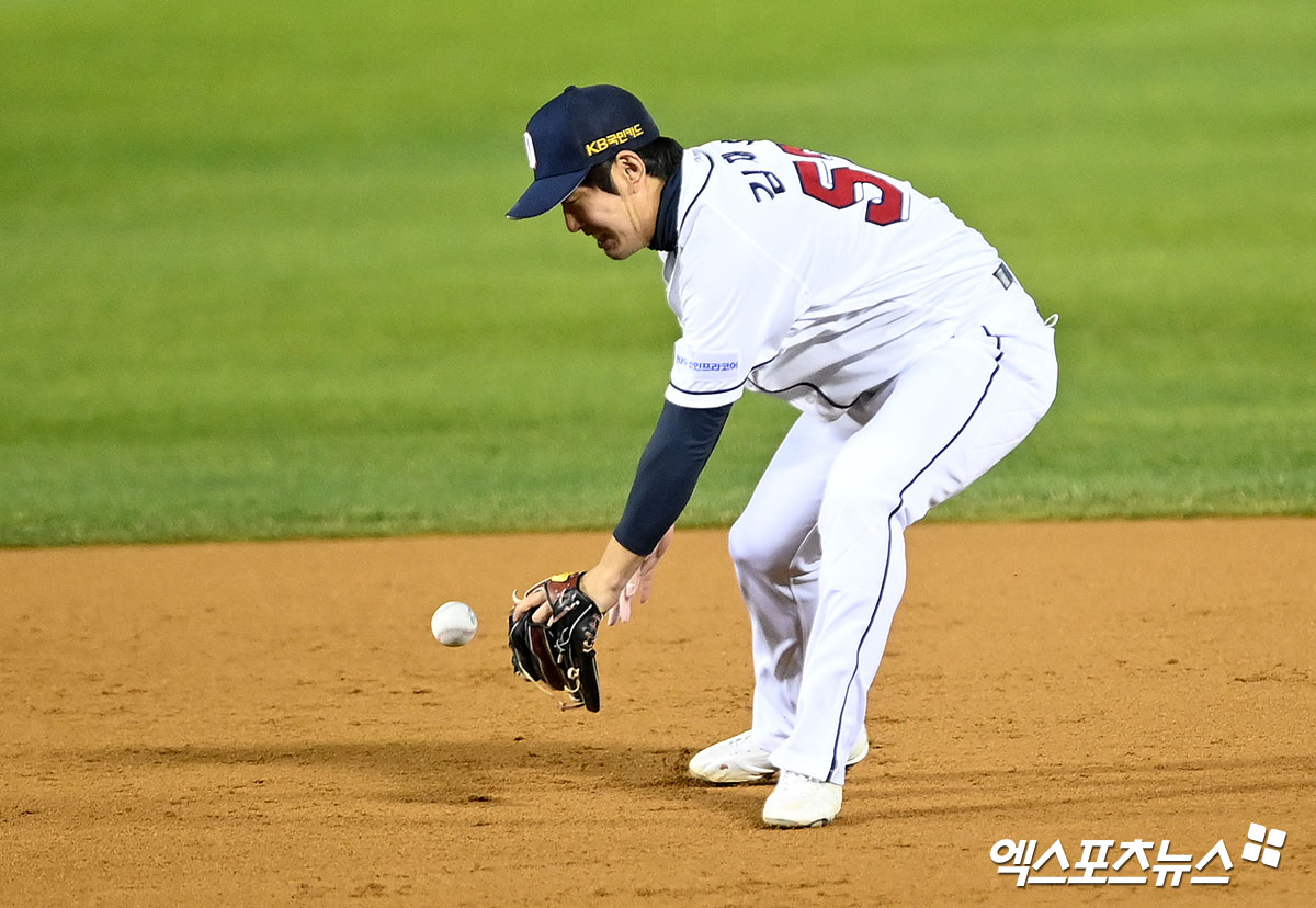 (엑스포츠뉴스 잠실, 김한준 기자) 5일 오후 서울 송파구 잠실야구장에서 열린 '2021 신한은행 SOL KBO리그' 포스트시즌 LG 트윈스와 두산 베어스의 준플레이오프 2차전 경기, 7회초 1사 2루 두산 김재호가 투수 맞고 굴절된 LG 김현수의 타구를 놓치고 있다.