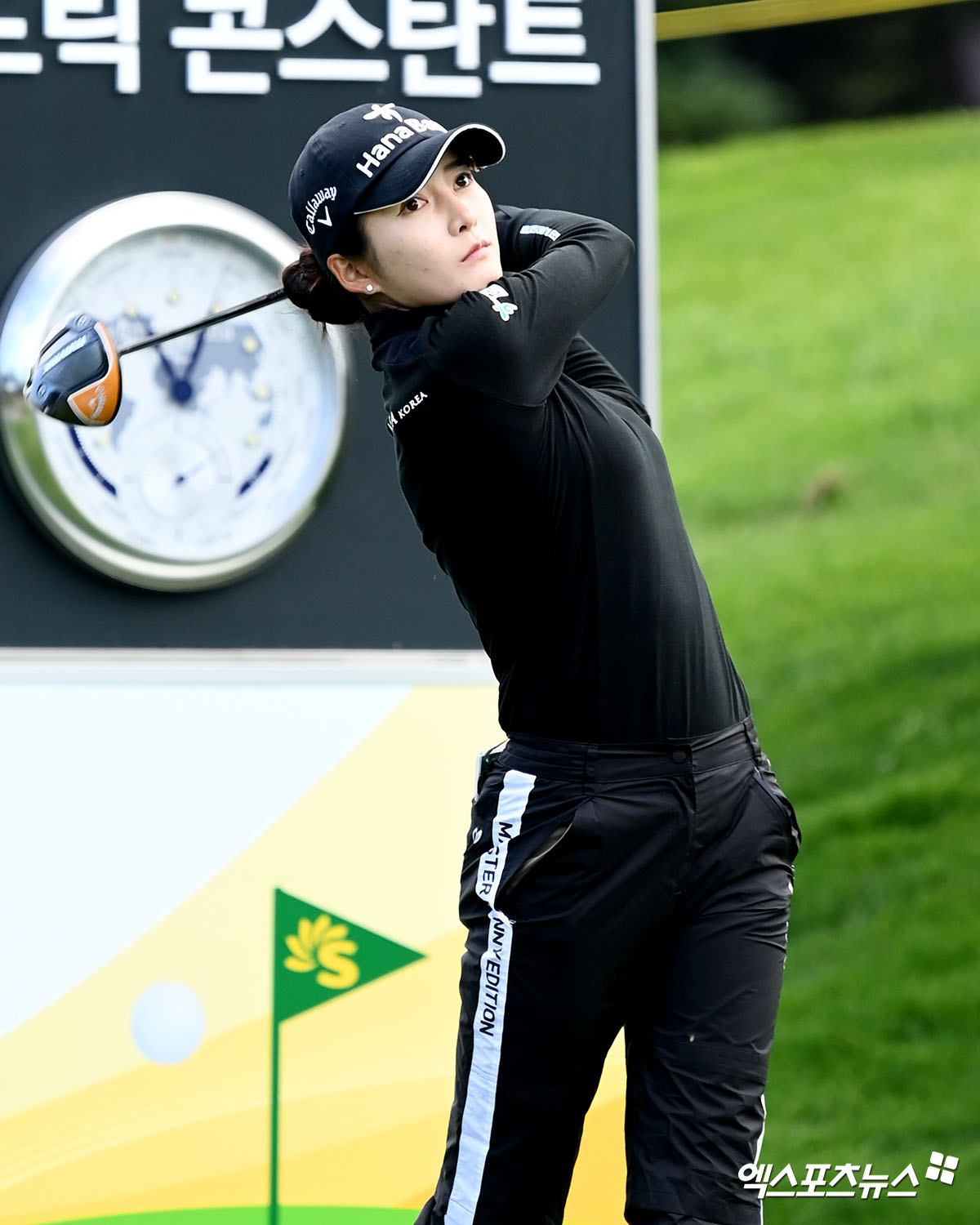 (엑스포츠뉴스 제주, 고아라 기자) 6일 제주 애월읍 엘리시안 제주 컨트리클럽(파72 / 6,653야드)에서 열린 '제15회 S-OIL 챔피언십'(총상금 7억 원, 우승상금 1억 2,600만 원) 2라운드 경기, 정지유가 1번홀 티샷을 날리고 있다.