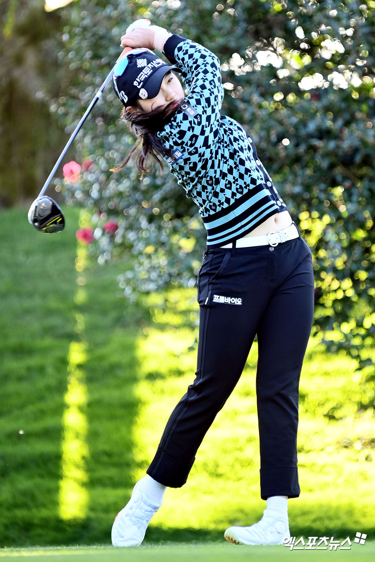 (엑스포츠뉴스 제주, 고아라 기자) 7일 제주 애월읍 엘리시안 제주 컨트리클럽(파72 / 6,653야드)에서 열린 '제15회 S-OIL 챔피언십'(총상금 7억 원, 우승상금 1억 2,600만 원) 최종라운드 경기, 박현경이 1번홀 티샷을 날리고 있다.