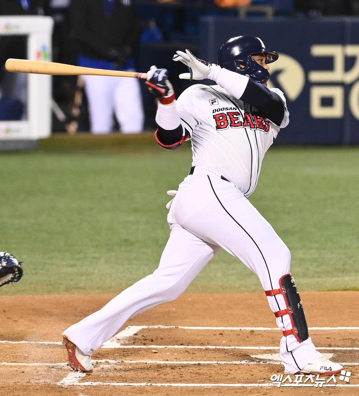 (엑스포츠뉴스 잠실, 고아라 기자) 10일 오후 서울 송파구 잠실야구장에서 열리는 '2021 신한은행 SOL KBO리그' 포스트시즌 삼성 라이온즈와 두산 베어스의 플레이오프 2차전 경기, 1회말 1사 두산 페르난데스가 1루타를 날리고 있다.