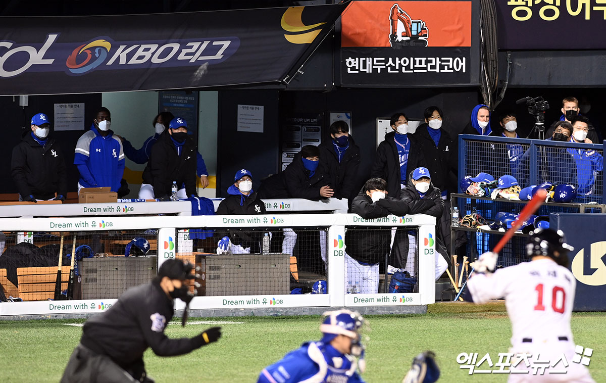 (엑스포츠뉴스 잠실, 고아라 기자) 10일 오후 서울 송파구 잠실야구장에서 열리는 '2021 신한은행 SOL KBO리그' 포스트시즌 삼성 라이온즈와 두산 베어스의 플레이오프 2차전 경기, 8회말 삼성 더그아웃에서 경기를 지켜보고 있다.