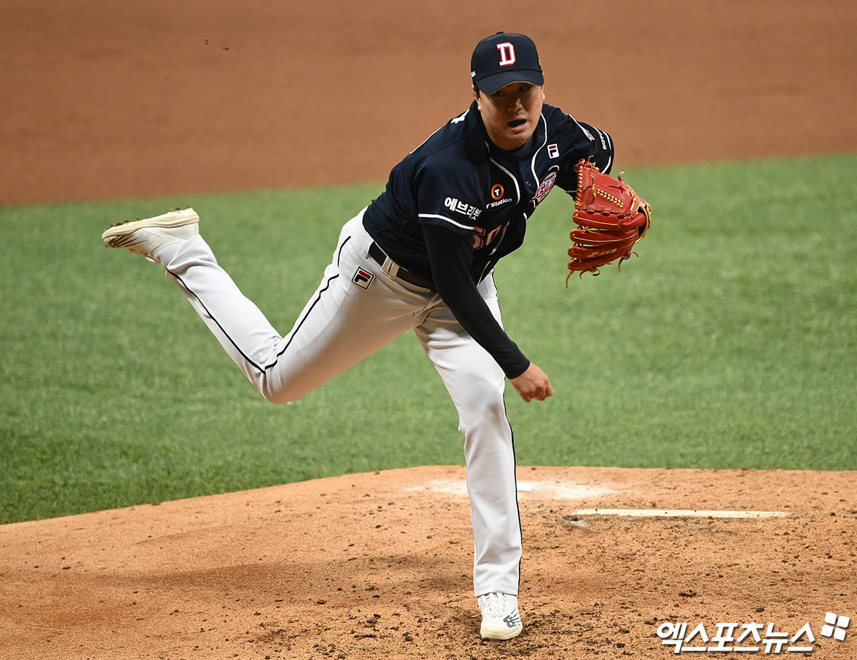 (엑스포츠뉴스 고척, 박지영 기자) 14일 오후 서울 구로구 고척스카이돔에서 열린 '2021 신한은행 SOL KBO리그' 포스트시즌 두산 베어스와 KT 위즈의 한국시리즈 1차전 경기, 6회말 두산 이영하가 역투하고 있다.