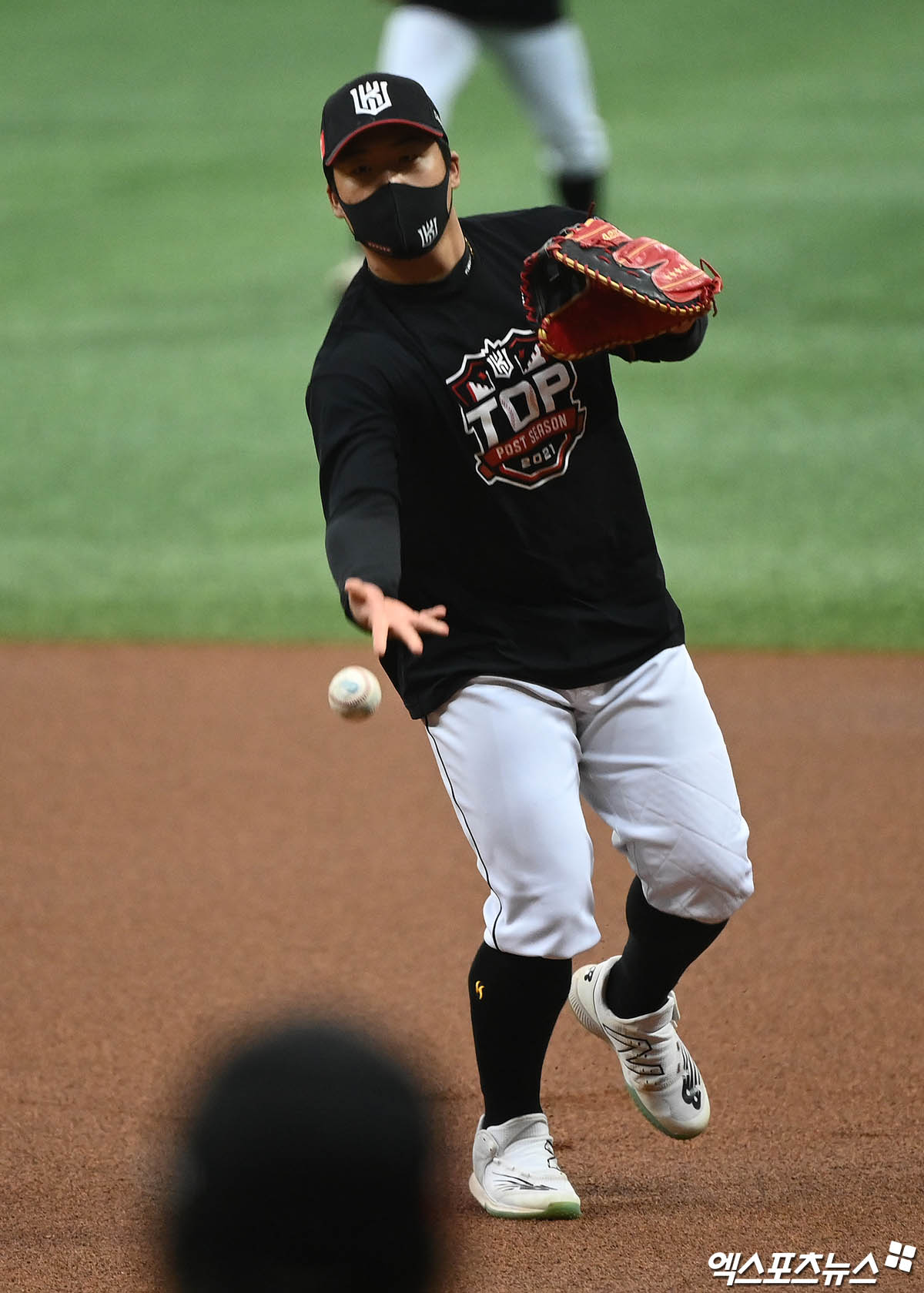 (엑스포츠뉴스 고척, 박지영 기자) 15일 오후 서울 구로구 고척스카이돔에서 열리는 '2021 신한은행 SOL KBO리그' 포스트시즌 두산 베어스와 KT 위즈의 한국시리즈 2차전 경기에 앞서 KT 강백호가 수비 훈련을 하고 있다.