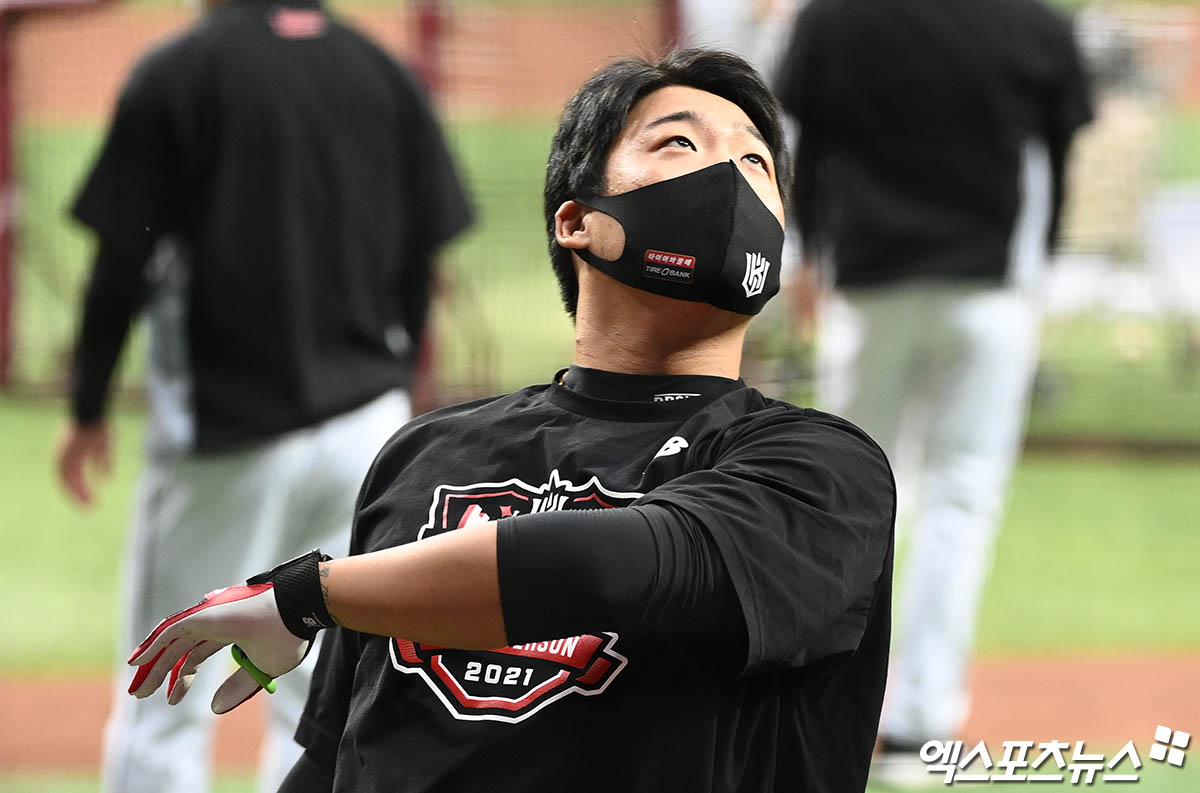 (엑스포츠뉴스 고척, 박지영 기자) 15일 오후 서울 구로구 고척스카이돔에서 열리는 '2021 신한은행 SOL KBO리그' 포스트시즌 두산 베어스와 KT 위즈의 한국시리즈 2차전 경기에 앞서 KT 강백호가 타격 훈련을 하고 있다.