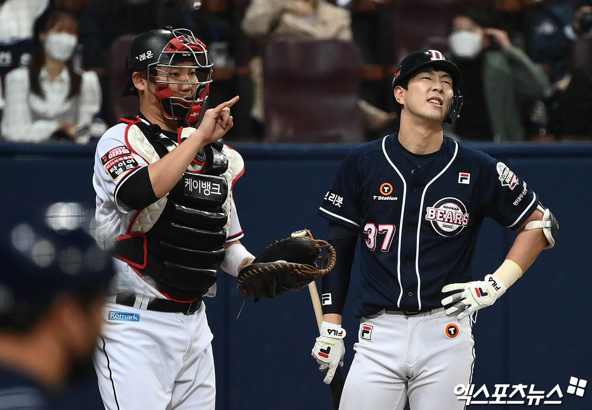 (엑스포츠뉴스 고척, 박지영 기자) 15일 오후 서울 구로구 고척스카이돔에서 열린 '2021 신한은행 SOL KBO리그' 포스트시즌 두산 베어스와 KT 위즈의 한국시리즈 2차전 경기, 4회초 1사 2루 두산 박건우가 3구 삼진으로 물러나며 아쉬워하고 있다.