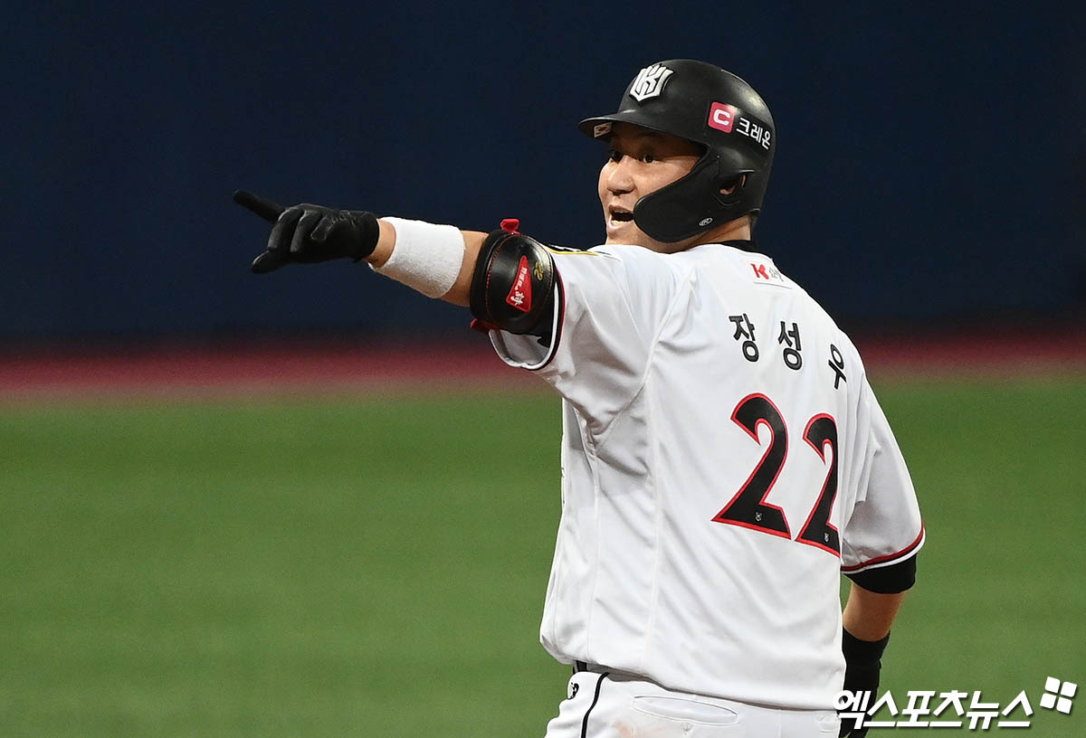 (엑스포츠뉴스 고척, 박지영 기자) 15일 오후 서울 구로구 고척스카이돔에서 열린 '2021 신한은행 SOL KBO리그' 포스트시즌 두산 베어스와 KT 위즈의 한국시리즈 2차전 경기, 5회말 1사 만루 KT 장성우가 2타점 적시 2루타를 때려낸 뒤 세리머니를 하고 있다.