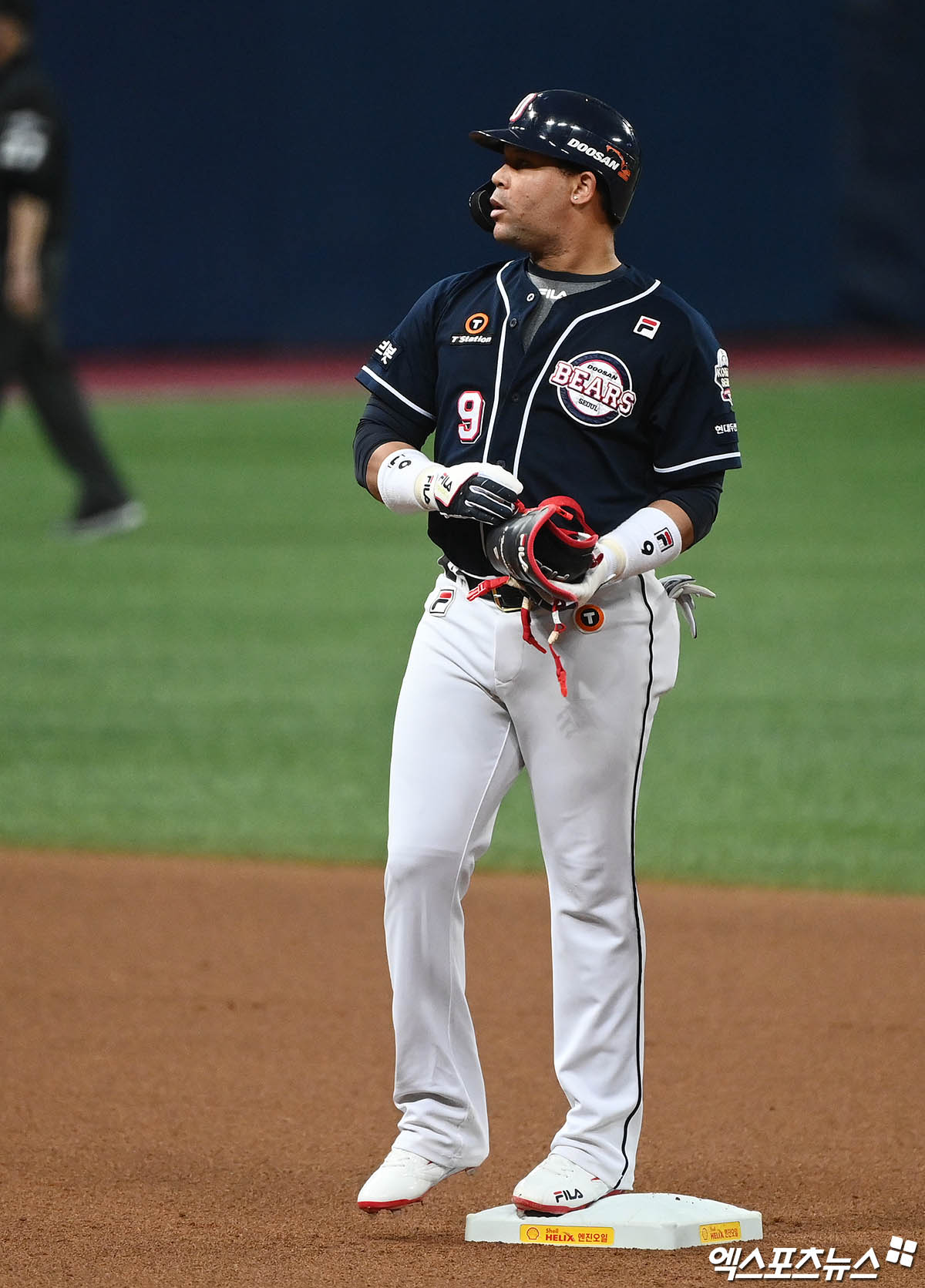 (엑스포츠뉴스 고척, 박지영 기자) 15일 오후 서울 구로구 고척스카이돔에서 열린 '2021 신한은행 SOL KBO리그' 포스트시즌 두산 베어스와 KT 위즈의 한국시리즈 2차전 경기, 6회초 1사 두산 페르난데스가 2루타를 때려내고 있다.