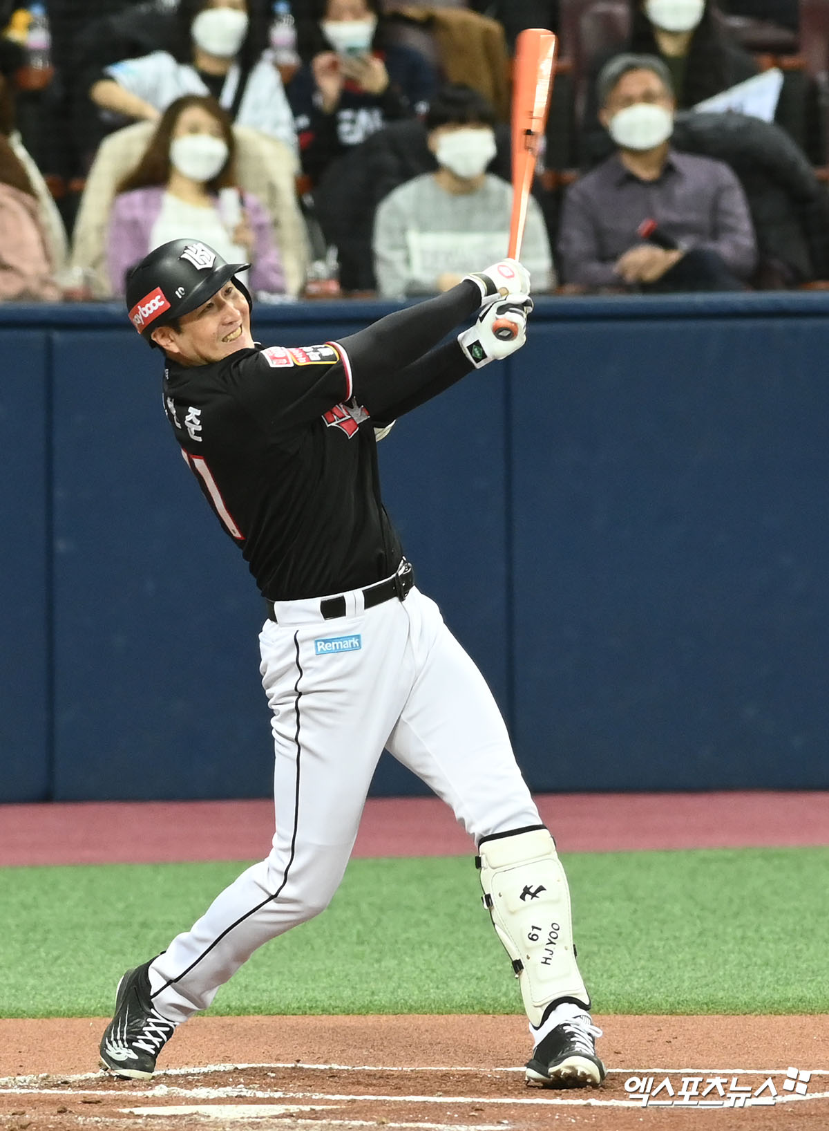 (엑스포츠뉴스 고척, 고아라 기자) 17일 오후 서울 구로구 고척스카이돔에서 열린 '2021 신한은행 SOL KBO리그' 포스트시즌 KT 위즈와 두산 베어스의 한국시리즈 3차전 경기, 2회초 KT 유한준이 2루타를 날리고 있다.