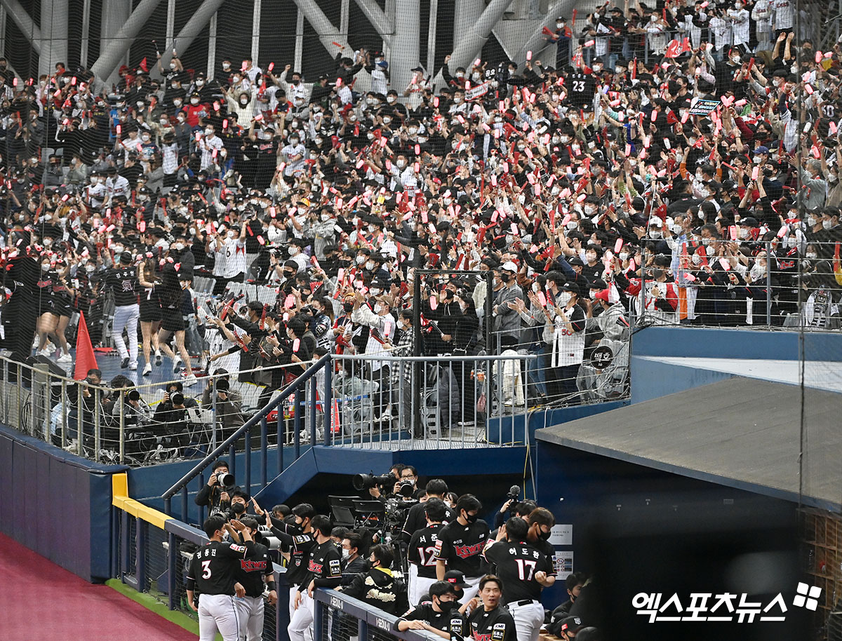 (엑스포츠뉴스 고척, 김한준 기자) 17일 오후 서울 구로구 고척스카이돔에서 열린 '2021 신한은행 SOL KBO리그' 포스트시즌 KT 위즈와 두산 베어스의 한국시리즈 3차전 경기, 7회초 1사 1,3루 KT 조용호의 1타점 적시타가 나오자 KT 응원단이 기뻐하고 있다.