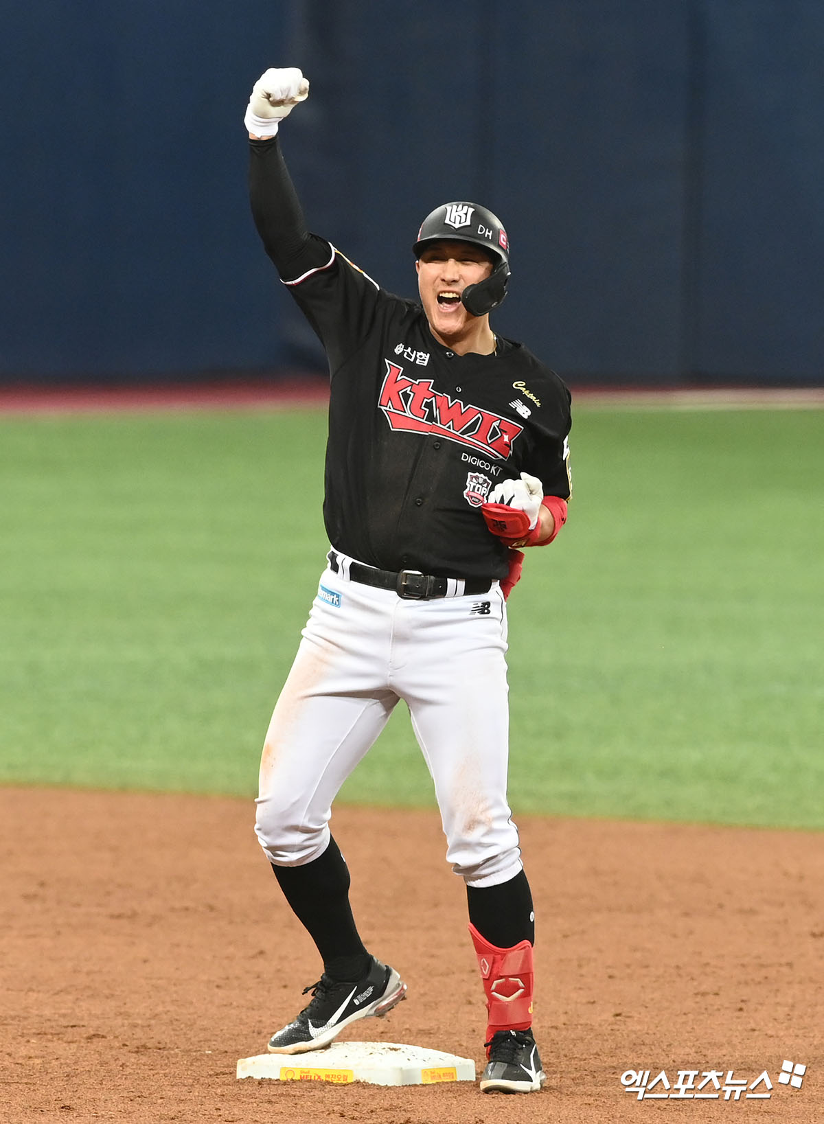 (엑스포츠뉴스 고척, 고아라 기자) 18일 오후 서울 구로구 고척스카이돔에서 열린 '2021 신한은행 SOL KBO리그' 포스트시즌 두산 베어스와 KT 위즈의 한국시리즈 4차전 경기, 2회초 1사 2루 KT 황재균이 1타점 적시타를 날린 뒤 세리머니를 하고 있다.
