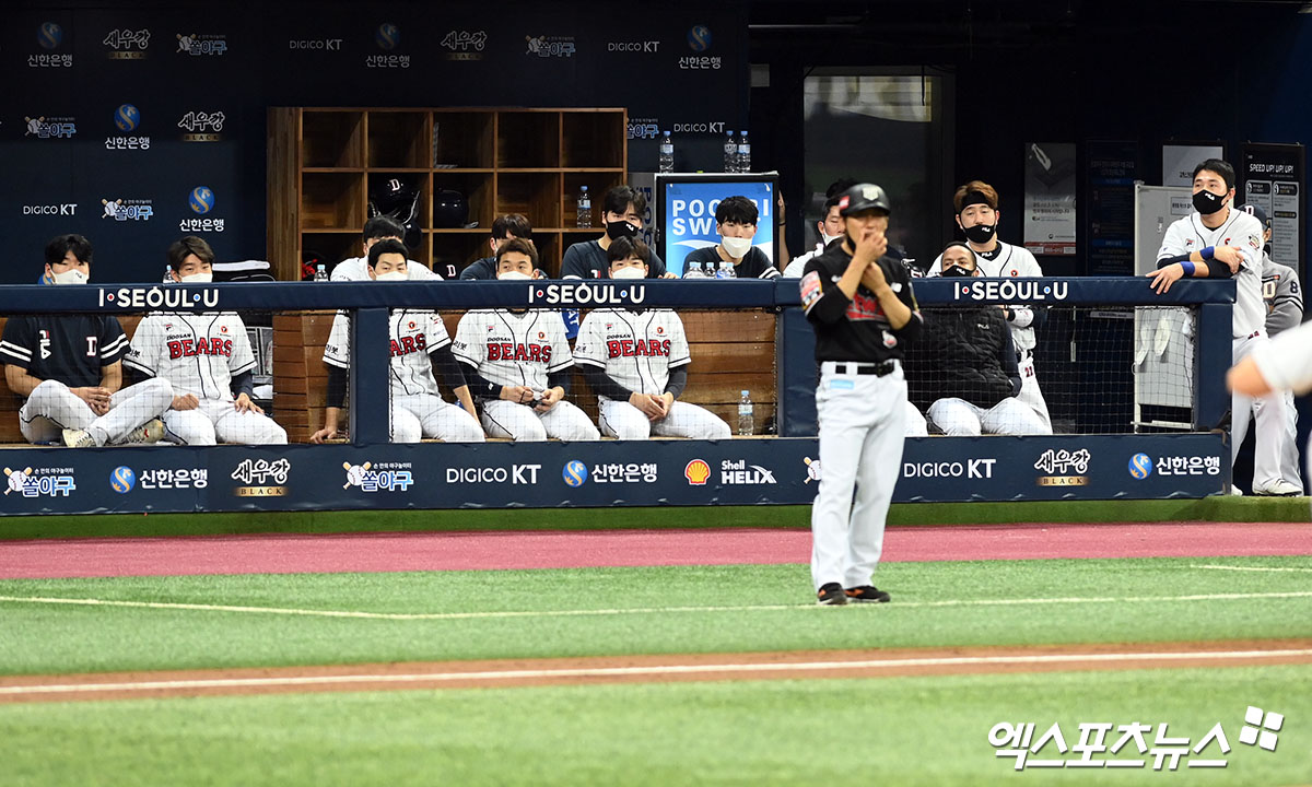 (엑스포츠뉴스 고척, 고아라 기자) 18일 오후 서울 구로구 고척스카이돔에서 열린 '2021 신한은행 SOL KBO리그' 포스트시즌 두산 베어스와 KT 위즈의 한국시리즈 4차전 경기, 3회초 두산 선수들이 더그아웃에서 경기를 지켜보고 있다.