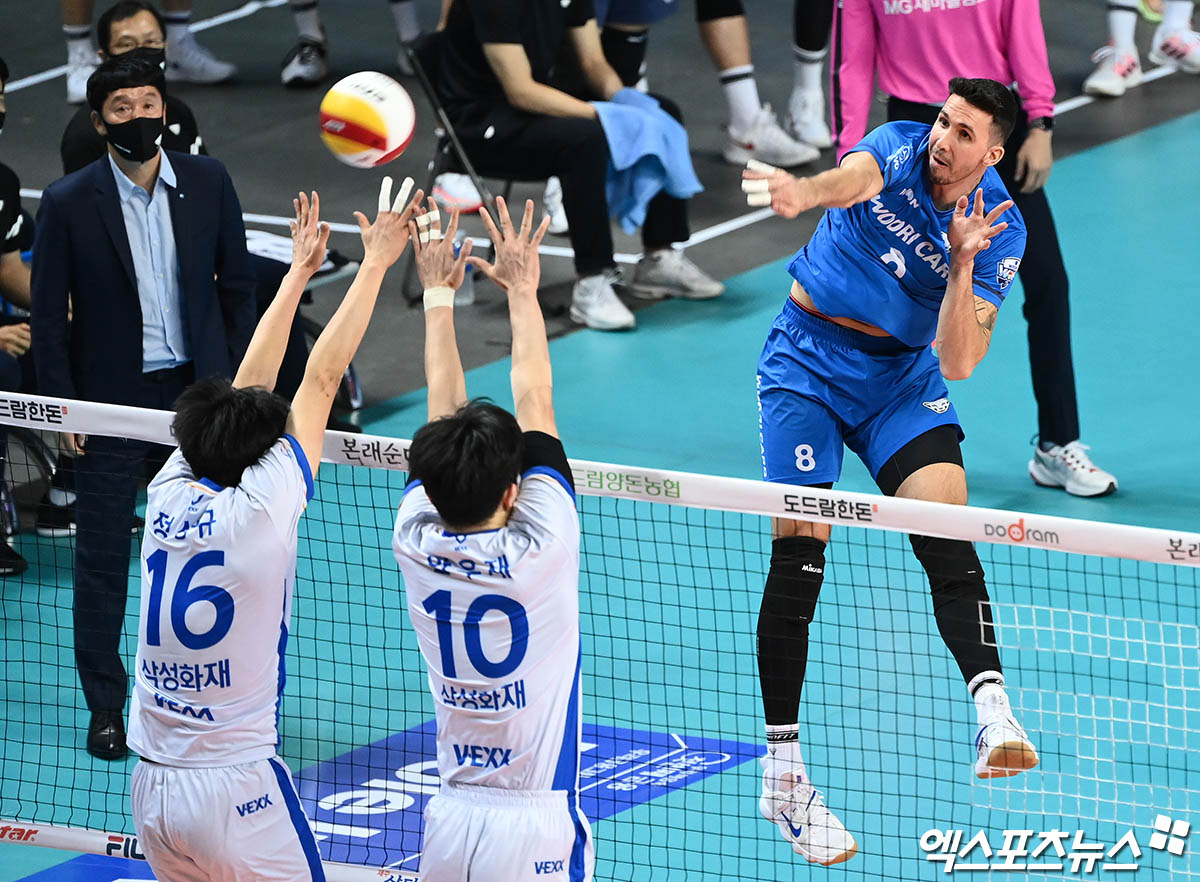 (엑스포츠뉴스 장충, 박지영 기자) 15일 오후 서울 장충체육관에서 열린 '2021-2022 도드람 V리그' 남자부 우리카드와 삼성화재의 경기, 우리카드 알렉스가 공격을 시도하고 있다.
