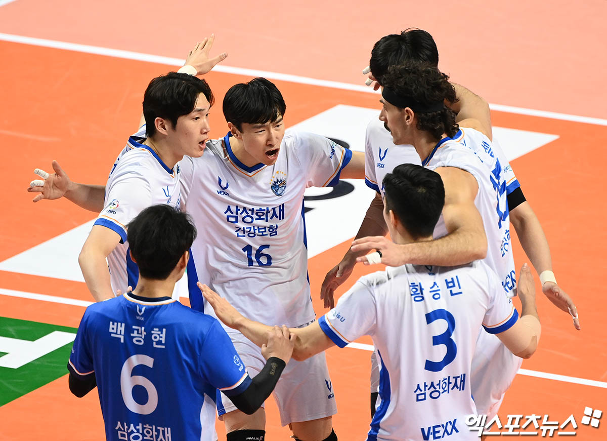 (엑스포츠뉴스 장충, 박지영 기자) 15일 오후 서울 장충체육관에서 열린 '2021-2022 도드람 V리그' 남자부 우리카드와 삼성화재의 경기, 삼성화재 선수들이 득점 후 환호하고 있다.