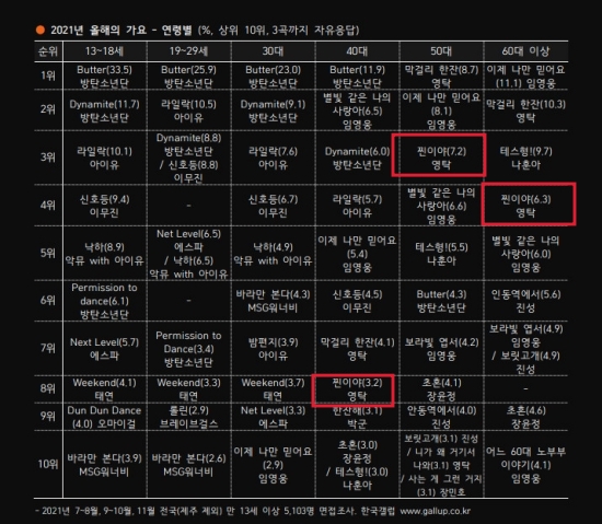2020년에 발매된 영탁의 ‘찐이야’는 2021년 한국갤럽 올해의 가요 부문에도 이름을 올리는 등 꾸준히 사랑을 받고 있다. 한국갤럽에 따르면, 영탁 ‘찐이야’는 60대 부문에서 4위, 50대 부문에서 3위, 40대 부문에서 8위를 기록했다.