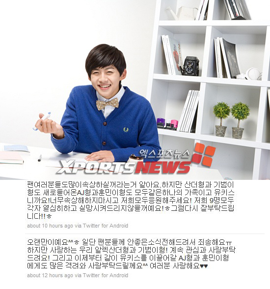 동호는 지난 8일 자신의 트위터( http://twitter.com/dongho94)에 "오랜만이에요. 일단 팬 여러분들께 안 좋은 소식 전해드려서 죄송해요. 하지만, 사랑하는 우리 알렉산더형과 기범이형! 계속 관심과 사랑 부탁드려요"라는 글을 남겼다.