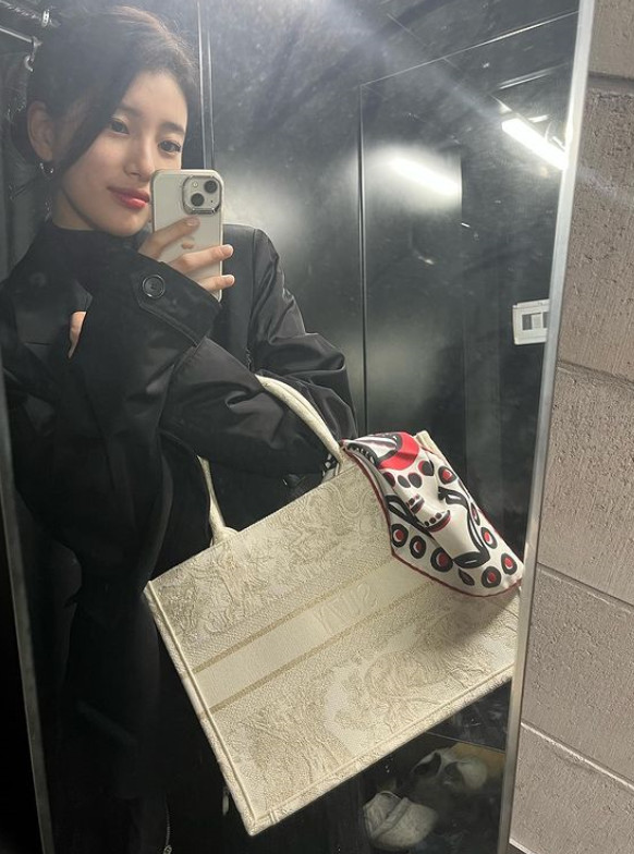 공개된 사진 속 수지는, D사 명품 가방을 들고 거울샷을 찍고 있다.