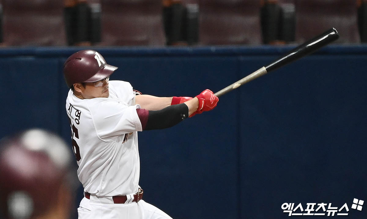 (엑스포츠뉴스 고척, 박지영 기자) 13일 오후 서울 구로구 고척스카이돔에서 열린 '2022 신한은행 SOL KBO리그' 시범경기 두산 베어스와 키움 히어로즈의 경기, 1회말 2사 만루 키움 이지영이 1타점 적시타를 때려내고 있다.