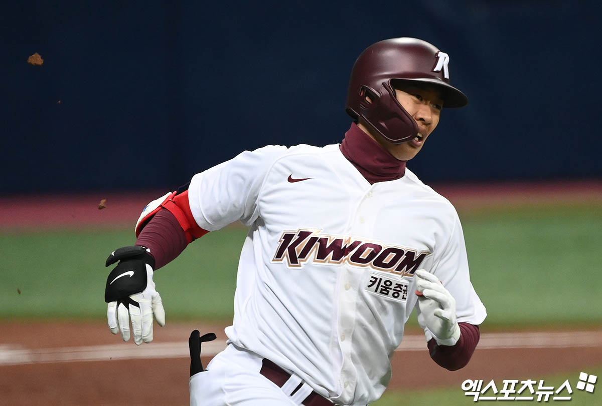 (엑스포츠뉴스 고척, 박지영 기자) 13일 오후 서울 구로구 고척스카이돔에서 열린 '2022 신한은행 SOL KBO리그' 시범경기 두산 베어스와 키움 히어로즈의 경기, 2회말 1사 키움 송성문이 안타를 때려낸 뒤 출루하고 있다.