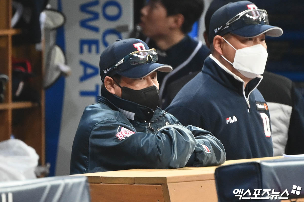 (엑스포츠뉴스 고척, 박지영 기자) 13일 오후 서울 구로구 고척스카이돔에서 열린 '2022 신한은행 SOL KBO리그' 시범경기 두산 베어스와 키움 히어로즈의 경기, 두산 김태형 감독이 경기를 지켜보고 있다.