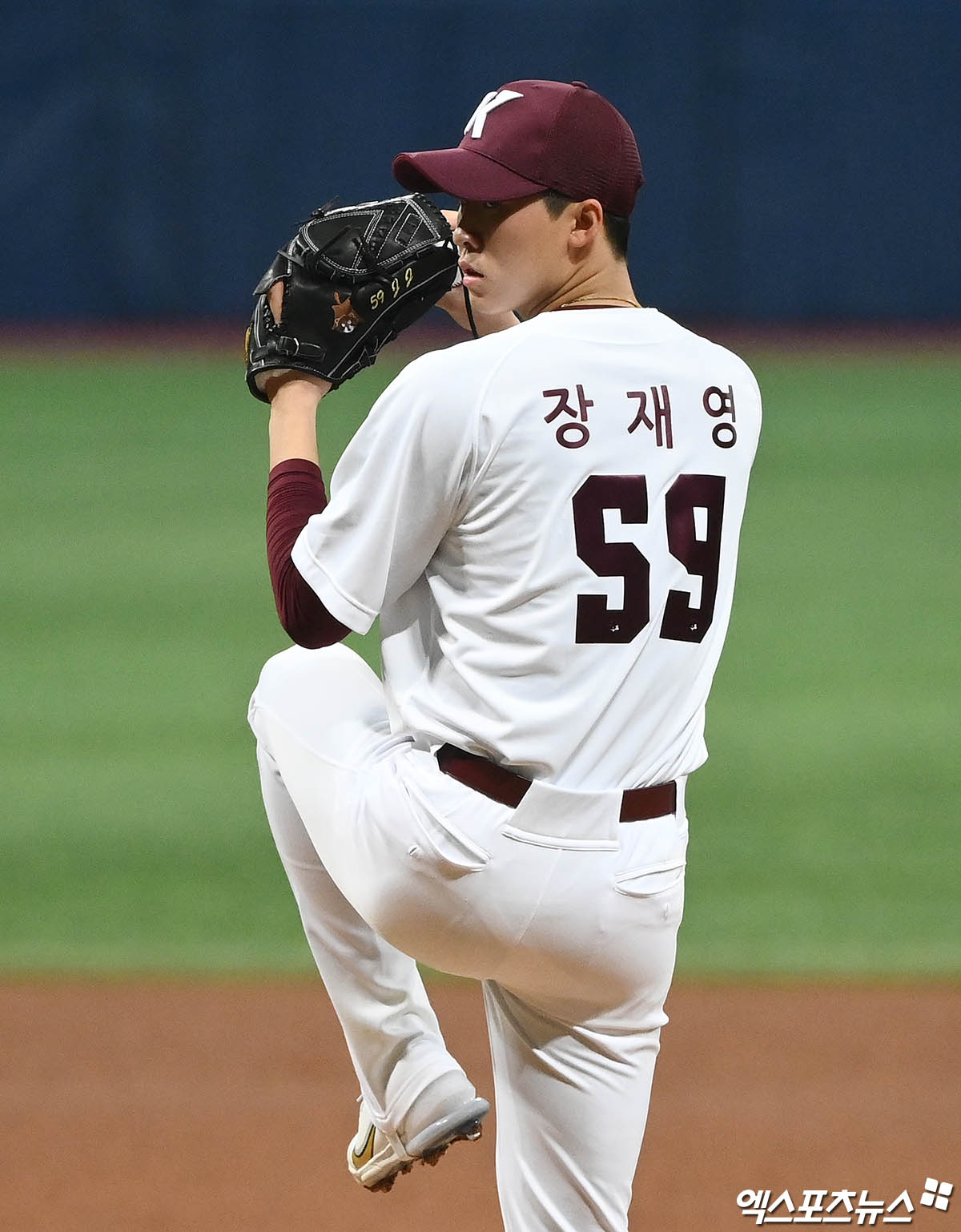 (엑스포츠뉴스 고척, 박지영 기자) 13일 오후 서울 구로구 고척스카이돔에서 열린 '2022 신한은행 SOL KBO리그' 시범경기 두산 베어스와 키움 히어로즈의 경기, 7회초 키움 장재영이 역투하고 있다.