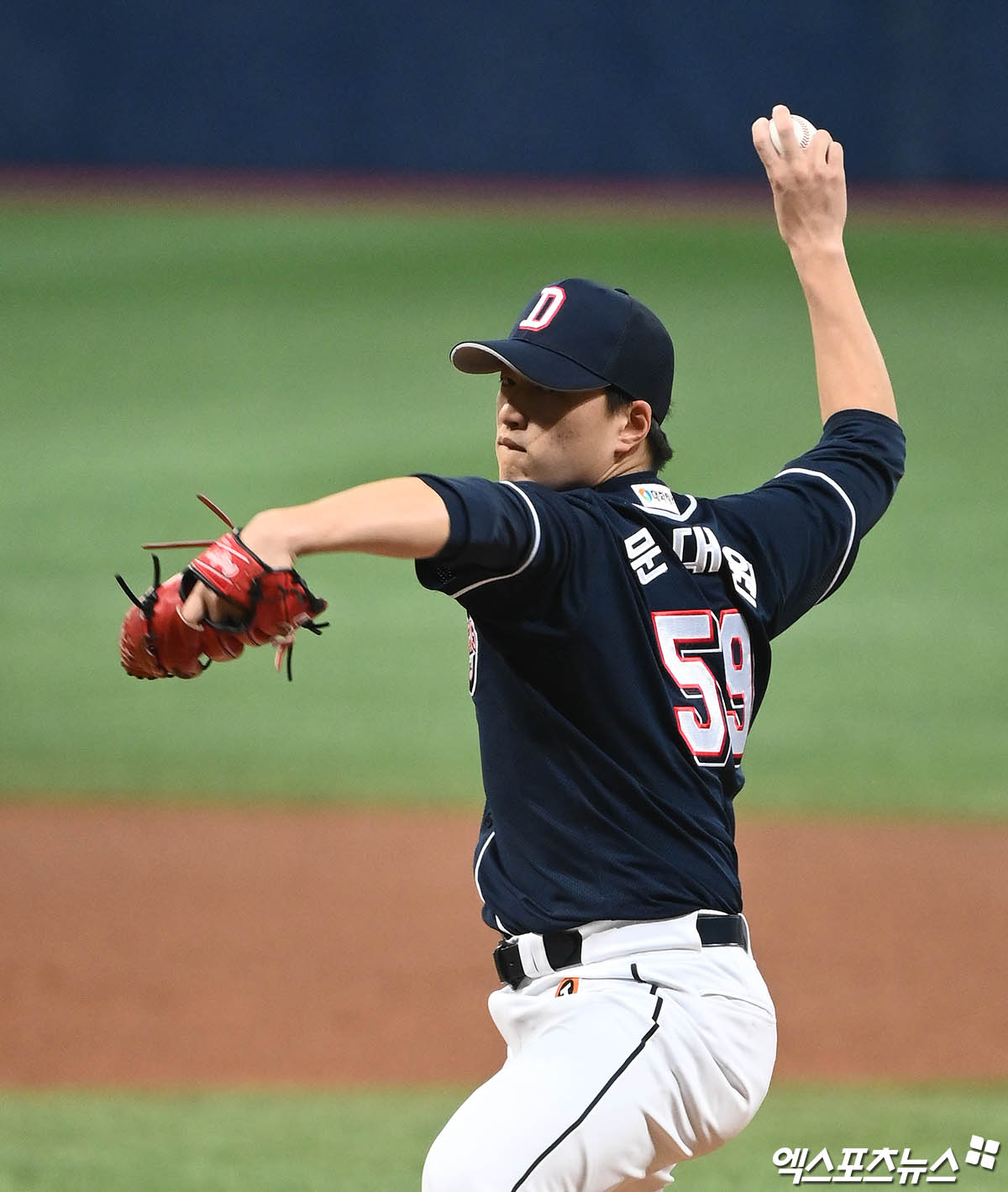 (엑스포츠뉴스 고척, 박지영 기자) 13일 오후 서울 구로구 고척스카이돔에서 열린 '2022 신한은행 SOL KBO리그' 시범경기 두산 베어스와 키움 히어로즈의 경기, 7회말 두산 문대원이 역투하고 있다.